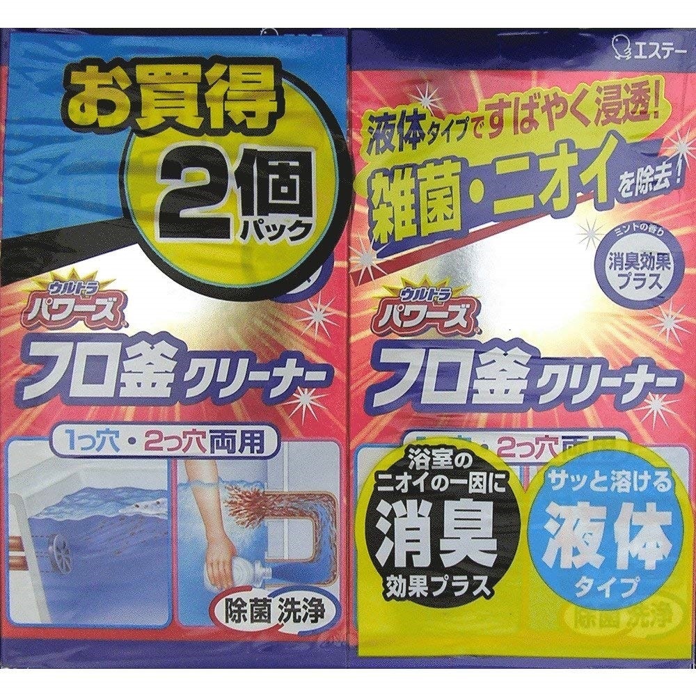 ウルトラパワーズ ふろ釜クリーナー 2個 エステー パイプ・風呂釜クリーナー JANコード:エステーについて 空気をかえよう 私たちのビジネスは、「空気ビジネス」です。 独自の空気ビジネスの新技術を活かして 新市場を創造し、お客様の暮らしを明るく元気にします。 事業内容 空気の力で、もっと楽しく暮らしやすく 私たちは生活に風呂釜クリーナーを使って風呂釜のお掃除をしました。 使ったのはエステー洗浄力 フロ釜クリーナー 液体タイプの風呂釜クリーナー。 風呂釜や見えない配管部分に潜む湯ドロやぬめりを洗浄できるんです。 1つ穴でも2つ穴でも使用できるタイプです。 1つ穴の我が家のお風呂での使い方